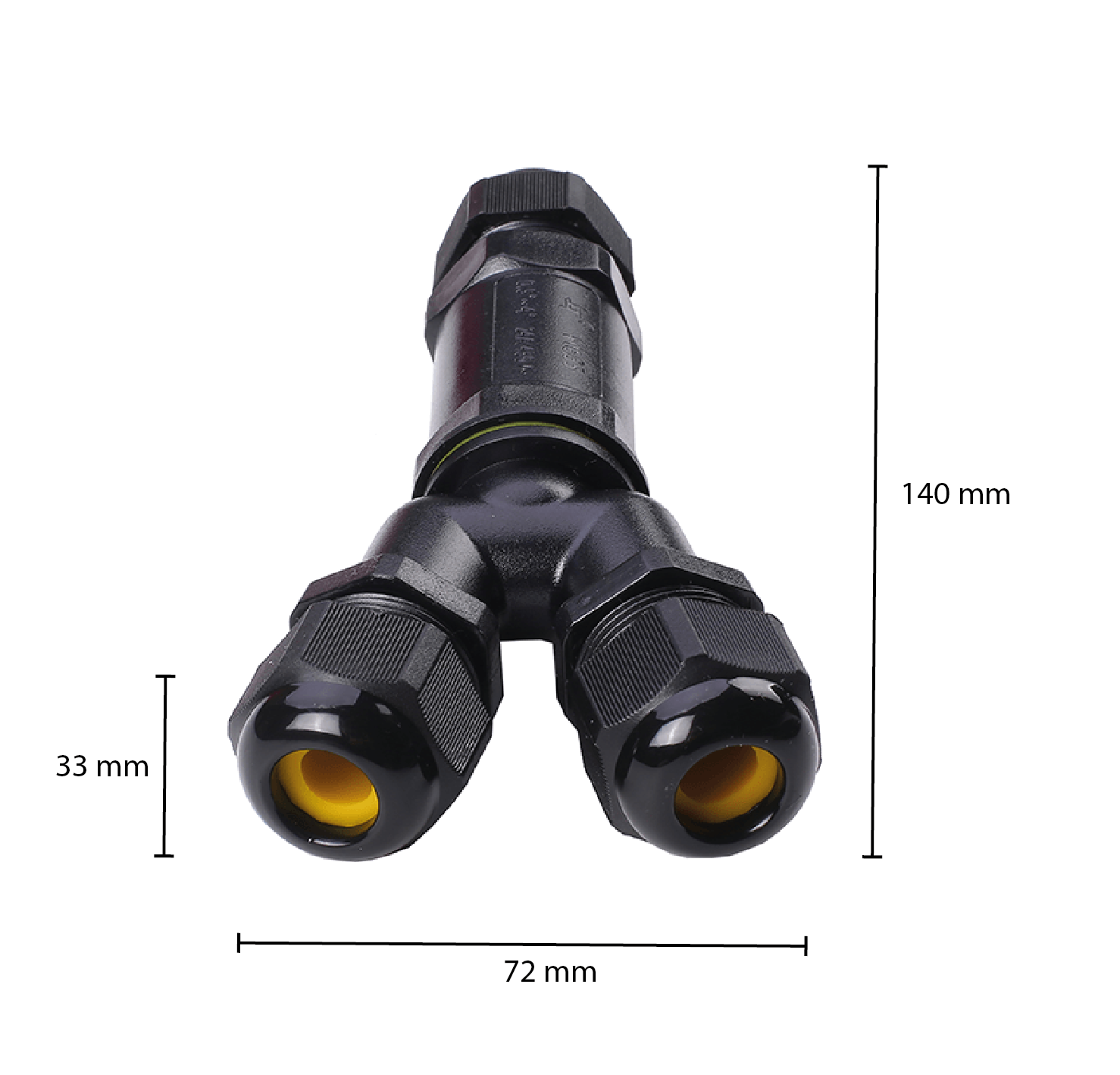 The connector is suitable for cables with an outer sheath of 4 mm to 8 mm and cores from 0.5 mm to 4 mm. This makes it a versatile solution for various cable types. The 5-pin Y-connector provides a secure, sturdy, and waterproof connection for up to 5 cores, with a maximum power rating of 450 V AC and a current of 24 A. This ensures reliable power transfer in a wide range of applications.