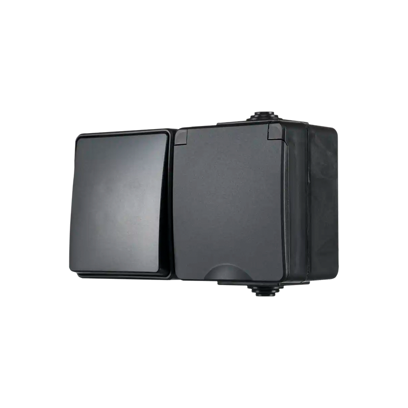 The IP55 Surface-Mounted Combination Wall Socket and Switch is easy to install and features a single-pole light switch, allowing you to easily control a lamp or group of lamps from a single location. When you operate the switch, it will not spring back and will not remain in its original position. Furthermore, it ensures that your appliances can be connected to the electricity supply through stylish outlets. The Surface-Mounted Combination Wall Socket and Switch is ideal for use in damp locations, such as gardens or sheds, thanks to its waterproof black components.