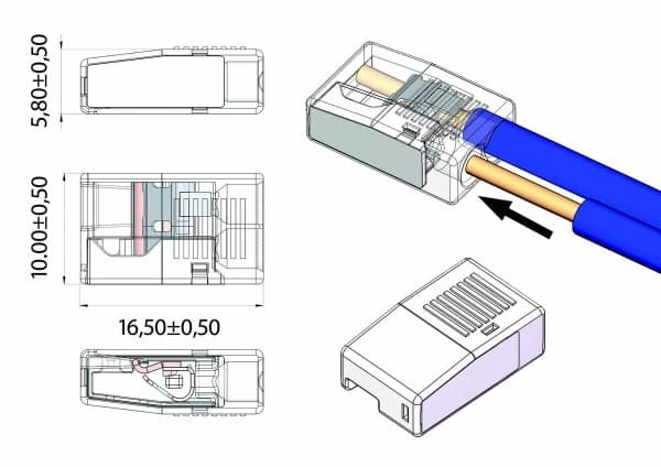 Its compact design and practical operation allow you to install the terminal block quickly and easily. You can easily connect two wires from 0.5 to 2.5 mm², increasing its versatility. This makes it the ideal choice for a variety of projects, from wiring electrical outlets to connecting lamps and other electrical equipment.