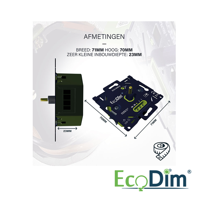 The ECO-DIM.15 LED dimmer is a high-quality dimmer specifically designed for optimal dimming of LED lamps up to 150 watts. Thanks to its versatility and smart technology, this dimmer is suitable for various types of lamps, including incandescent and halogen bulbs. The ECO-DIM.15 offers a user-friendly solution for both residential and commercial applications, with a focus on energy efficiency, light stability, and safety.