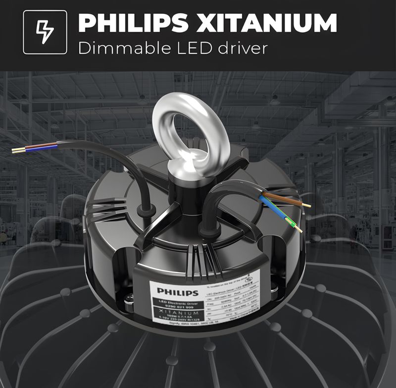 De geïntegreerde Philips driver is 1-10V dimbaar en volledig flikkervrij. Hierdoor kan de lichtsterkte eenvoudig worden aangepast van 100% tot 10% met een externe 1-10V LED dimmer (niet standaard meegeleverd), wat zorgt voor extra comfort en energiebesparing.
