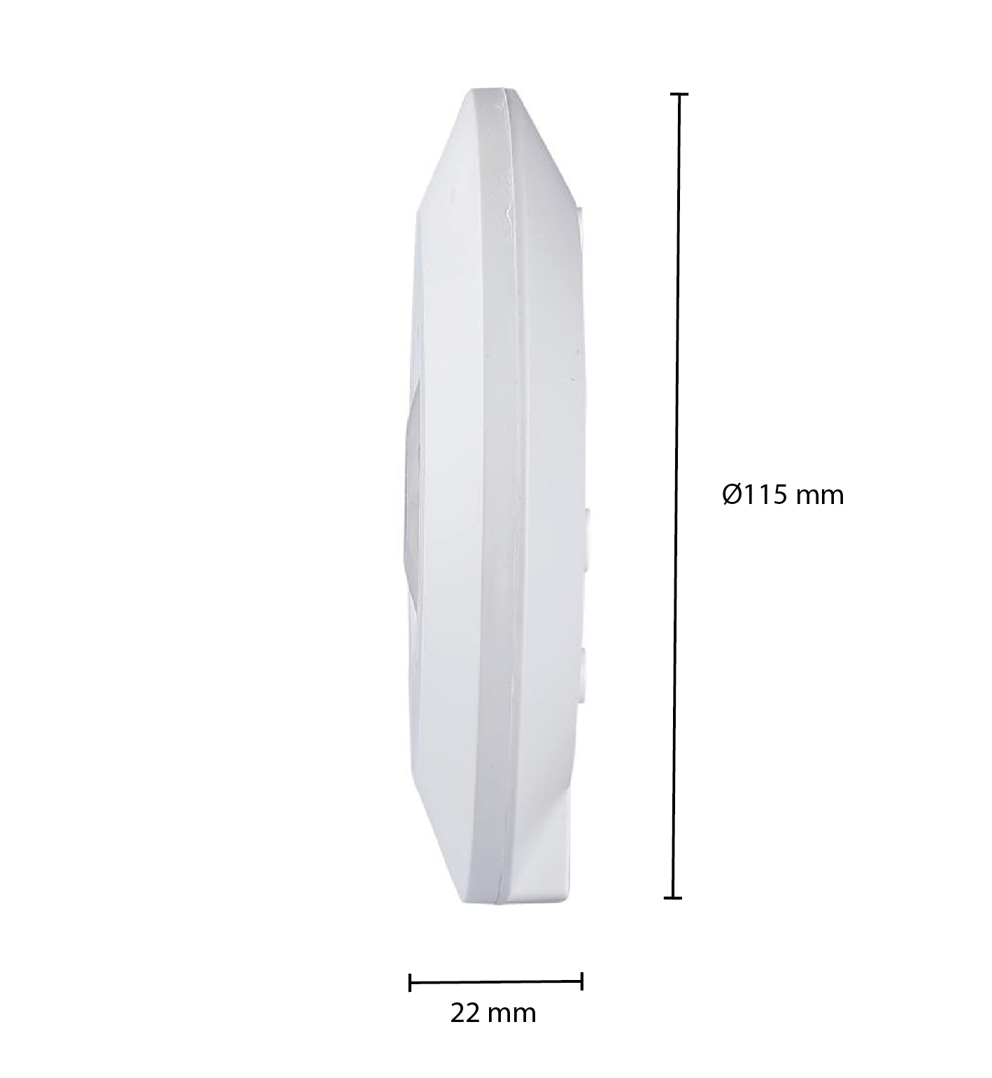 – Afmetingen: Met een diameter van 115 mm en een diepte van 22 mm is de installatie compact.
