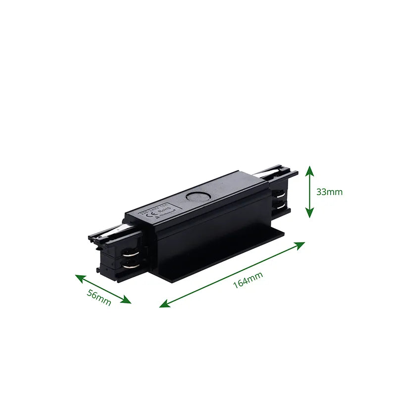 De connector heeft een afmeting van 164x56x33 mm, waardoor hij eenvoudig kan worden ingebouwd in de rail zonder uitstekende delen. Het product is gemaakt van hoogwaardig polycarbonaat (PC), wat zorgt voor stevigheid en langdurig gebruik zonder slijtage of vervorming. De connector wordt geleverd inclusief zwarte schroeven, wat zorgt voor een nette en professionele afwerking in zwarte railverlichtingssystemen.