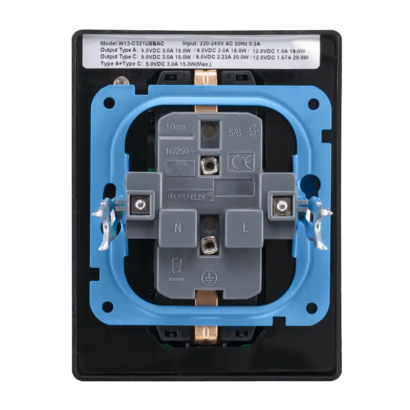 De wandcontactdoos is ontworpen voor eenvoudige montage. U kunt deze zonder moeite op een inbouwdoos bevestigen met klauw- of schroefbevestiging. De specificaties van deze wandcontactdoos zijn als volgt: