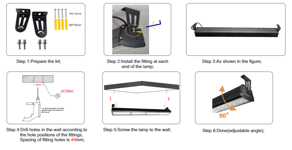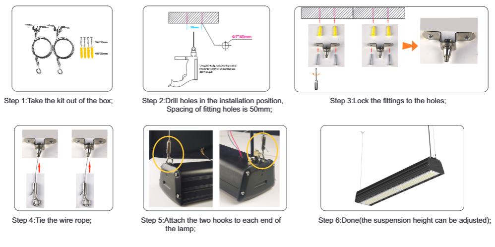 De LED Linear Highbay wordt geleverd inclusief ophangset en is geschikt voor zowel hangende montage als vaste installatie.